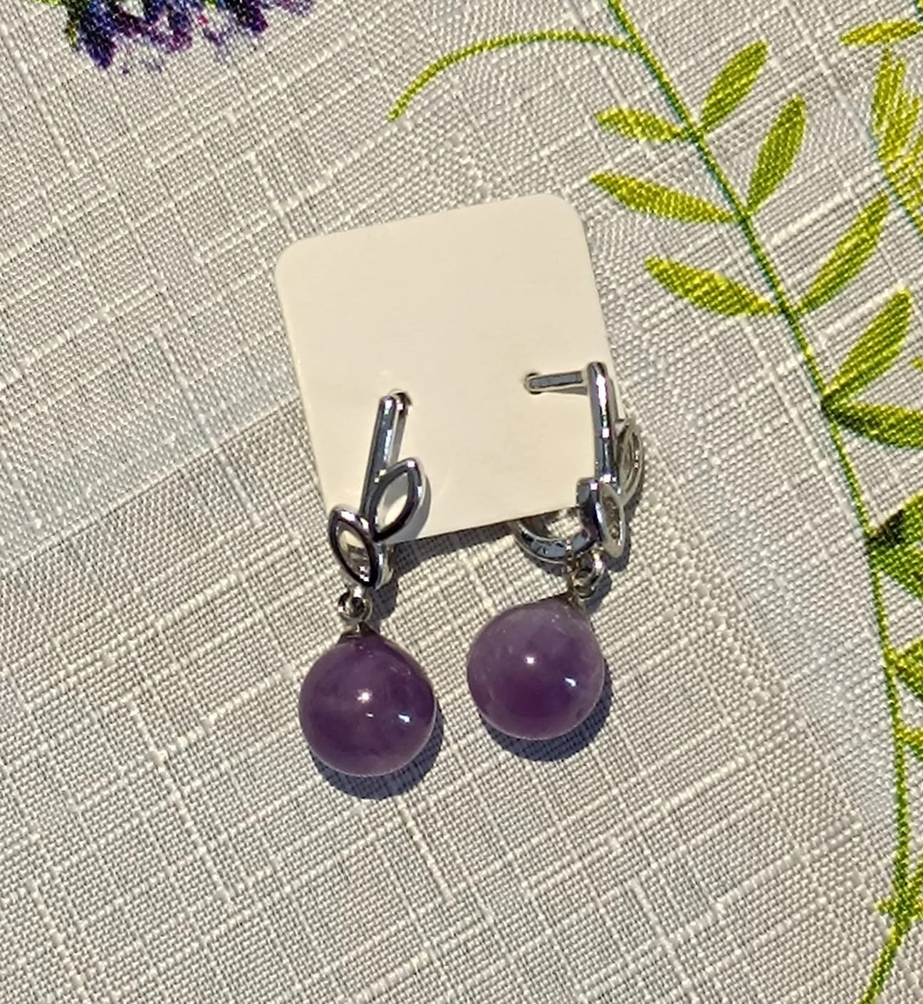 Golyó ametiszt, levél díszítéses, záras fülbevaló